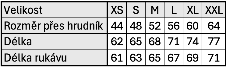 Velikostní tabulka v cm: