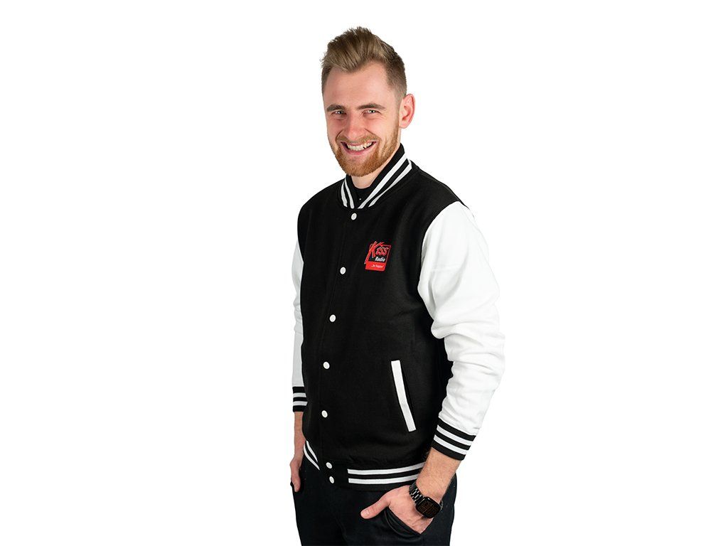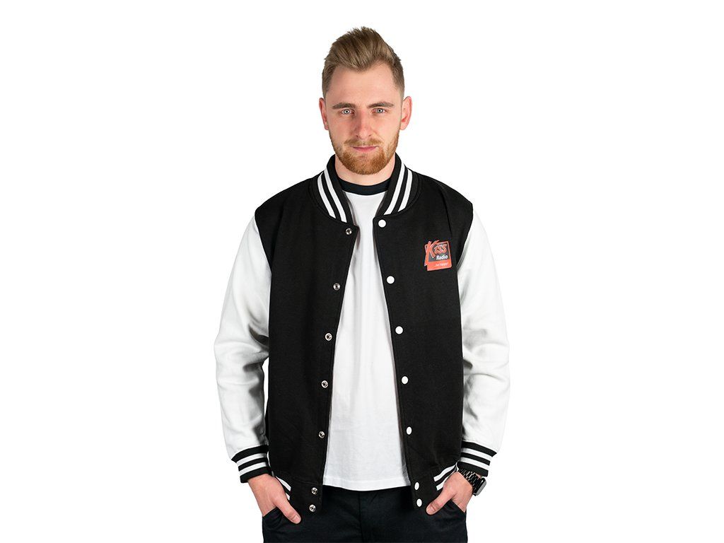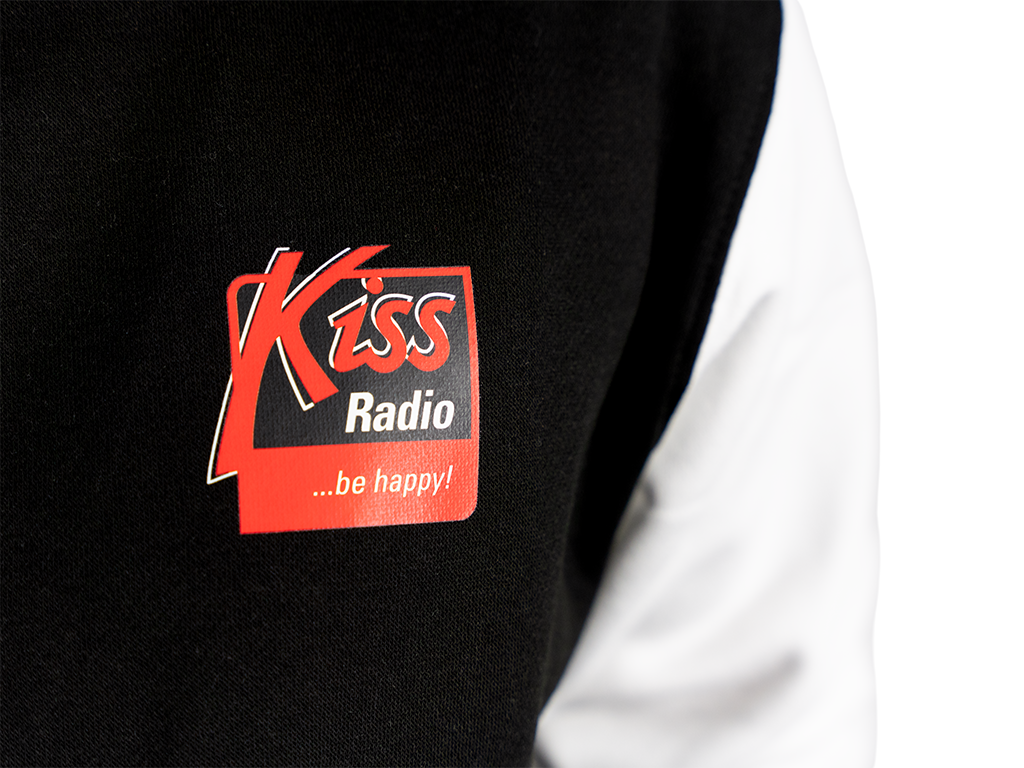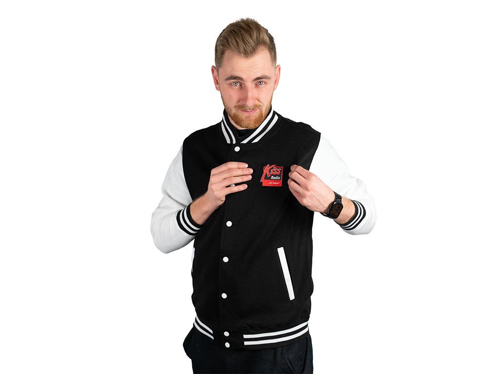 Kiss černá mikina v baseballovém stylu s logem rádia Kiss na prsu.