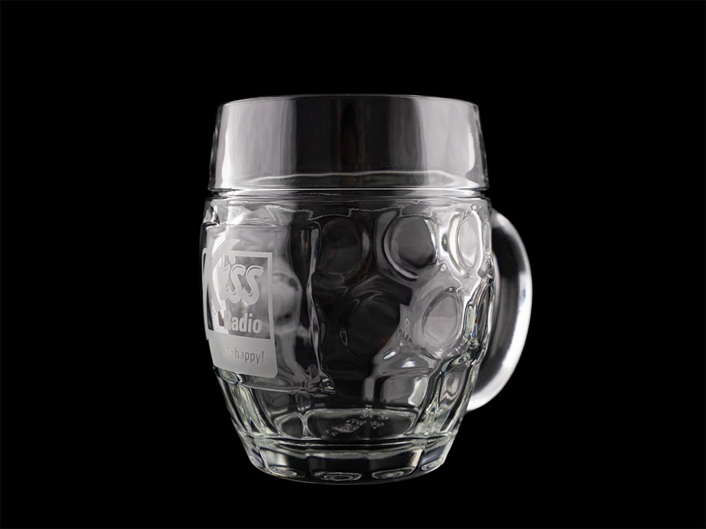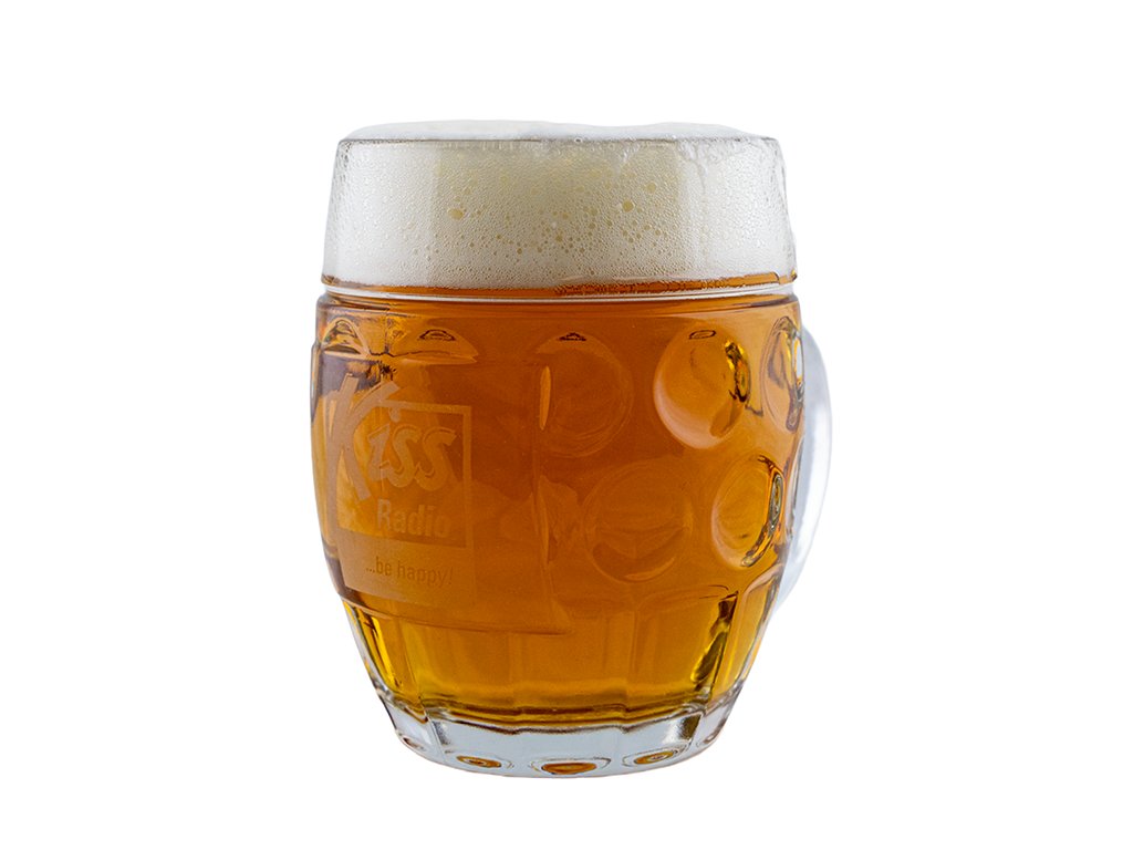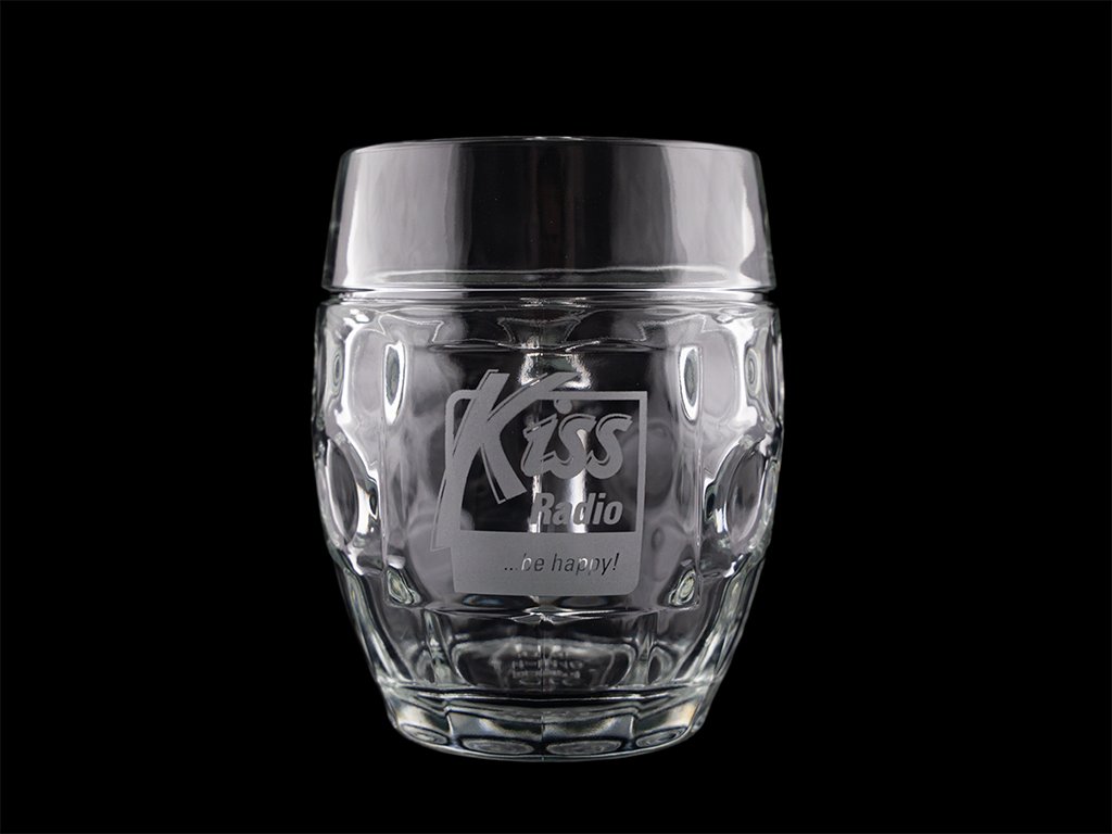Pivní půllitr s vygravírovaným logem Rádia Kiss z velmi odolného a silného skla + 2 podtácky ke každému půllitru.