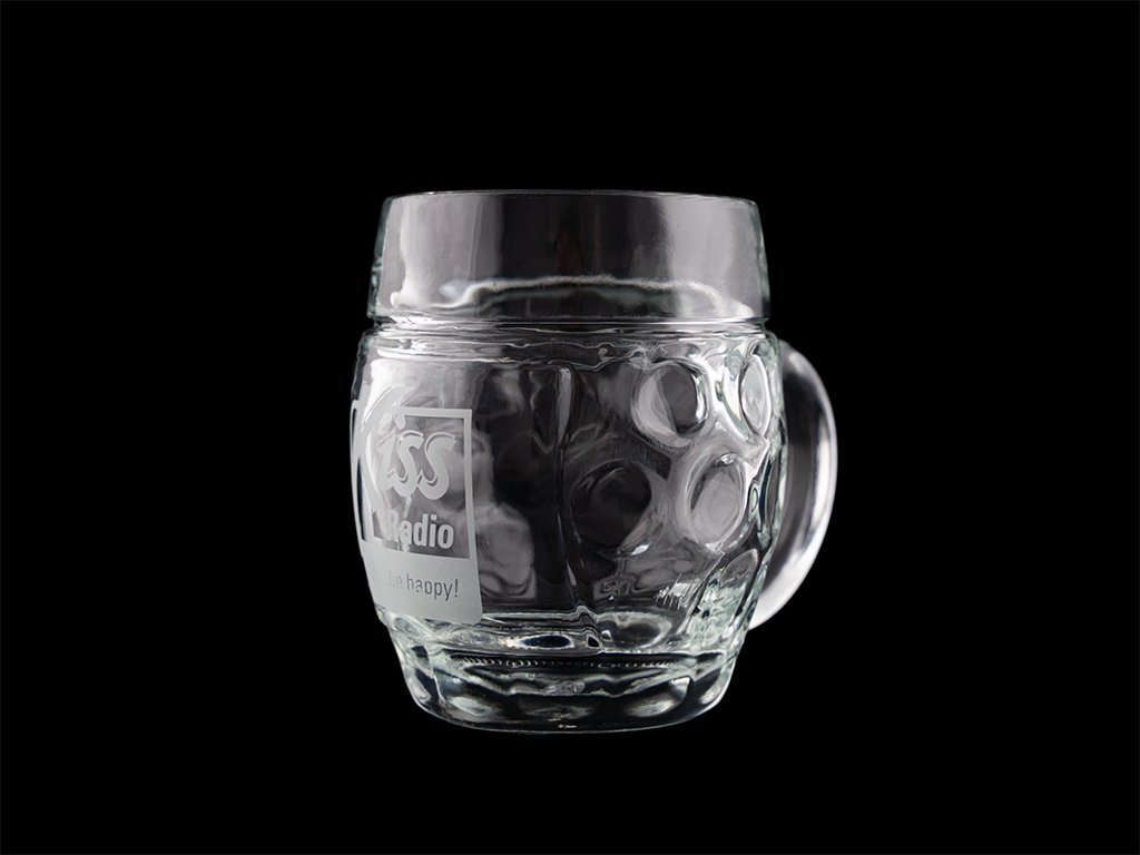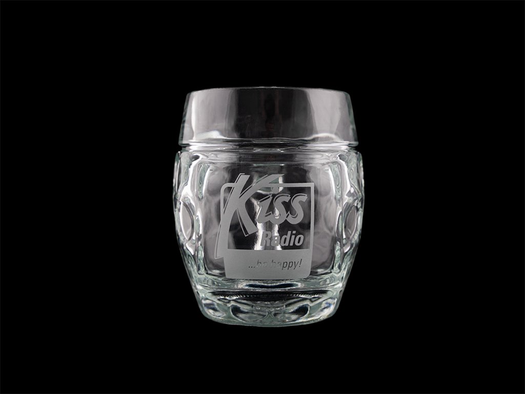 Třetinka s vygravírovaným logem Rádia Kiss z velmi odolného a silného skla.